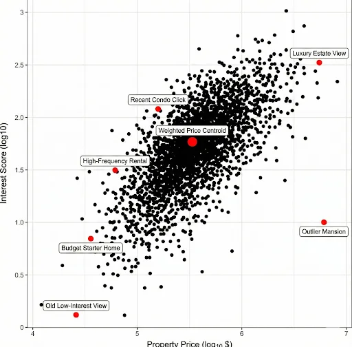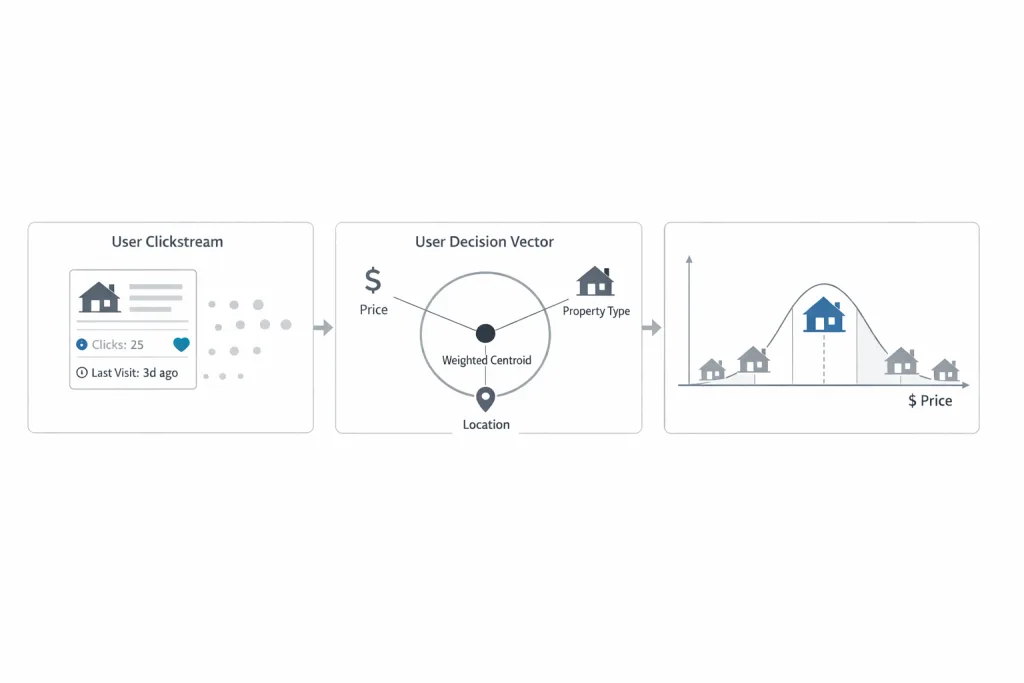 The Impact: This creates a centroid that shifts dynamically. If a user viewed a $5M mansion a year ago (low Score due to time decay) but viewed ten $200k condos yesterday (high Score), the centroid will firmly settle around $200k. We also use weighted counters to classify users into behavioral clusters: Buyer, Renter, or Hybrid.